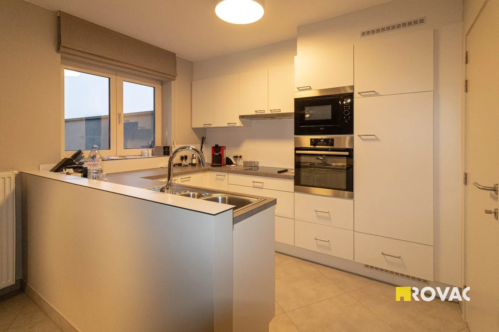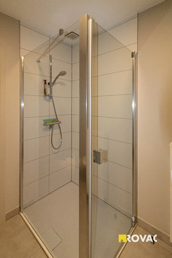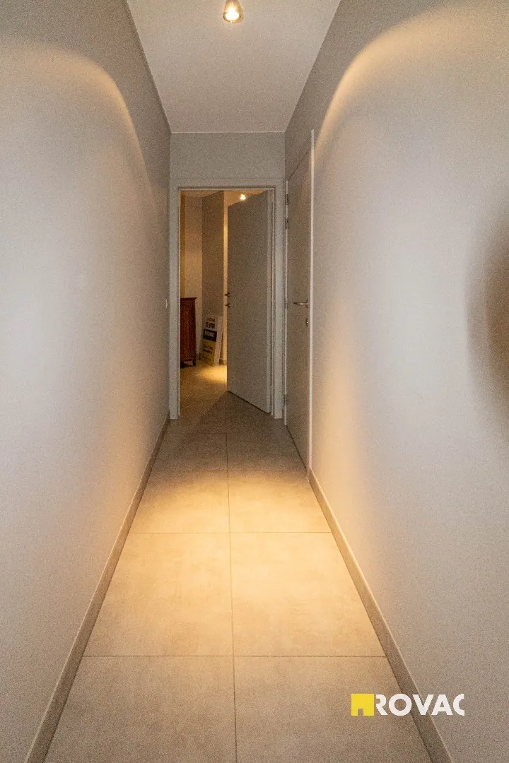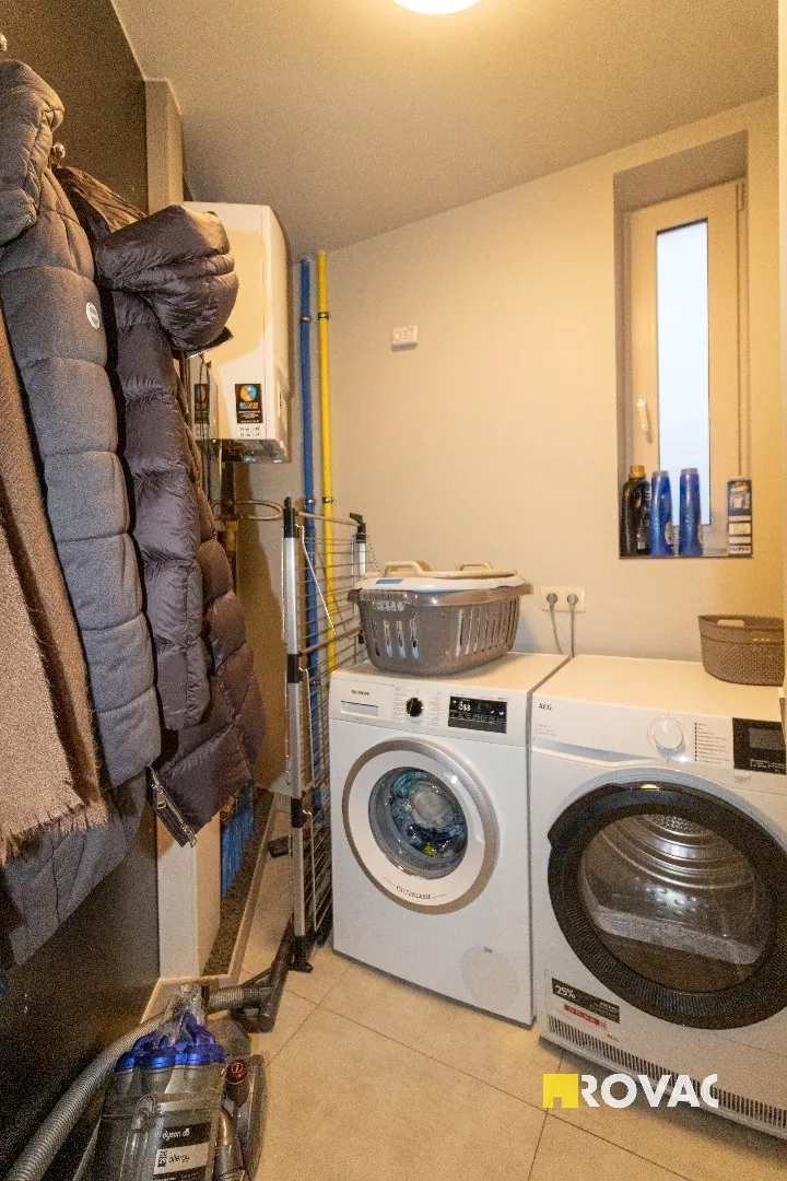 Volledig instapklaar en ruim appartement uitgerust met centrale verwarming op aardgas, bestaande uit inkomhal met gastentoilet, bergruimte/wasplaats, leefruimte voorzien van zonwerende screens met open ingerichte keuken voorzien van alle toestellen zoals kookplaat, koelkast, vaatwasmachine, oven en microgolfoven, extra bergruimte, ruim zonneterras, badkamer met inloopdouche en lavabomeubel, 2 slaapkamers, ruime garage voorzien van elektriciteit.