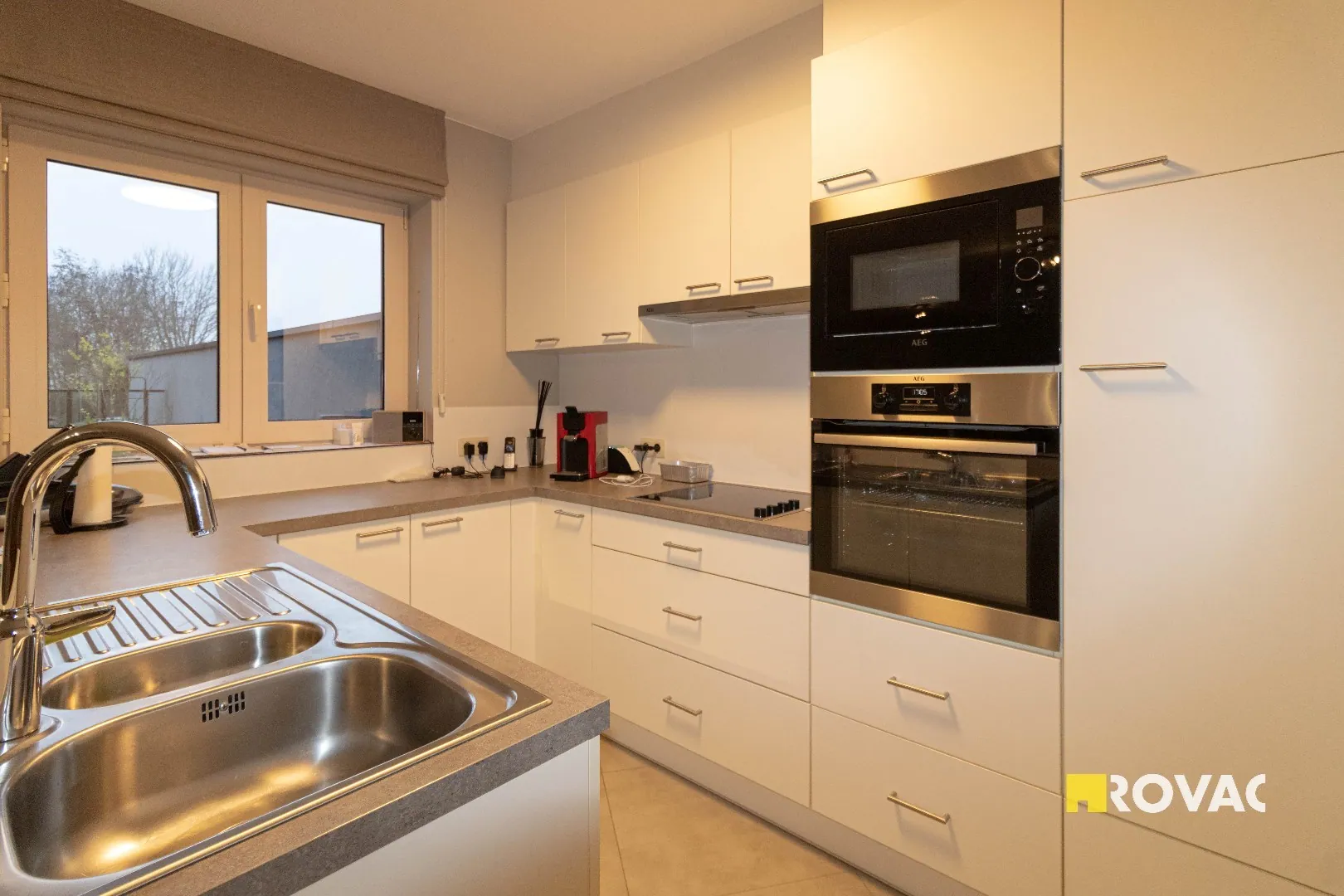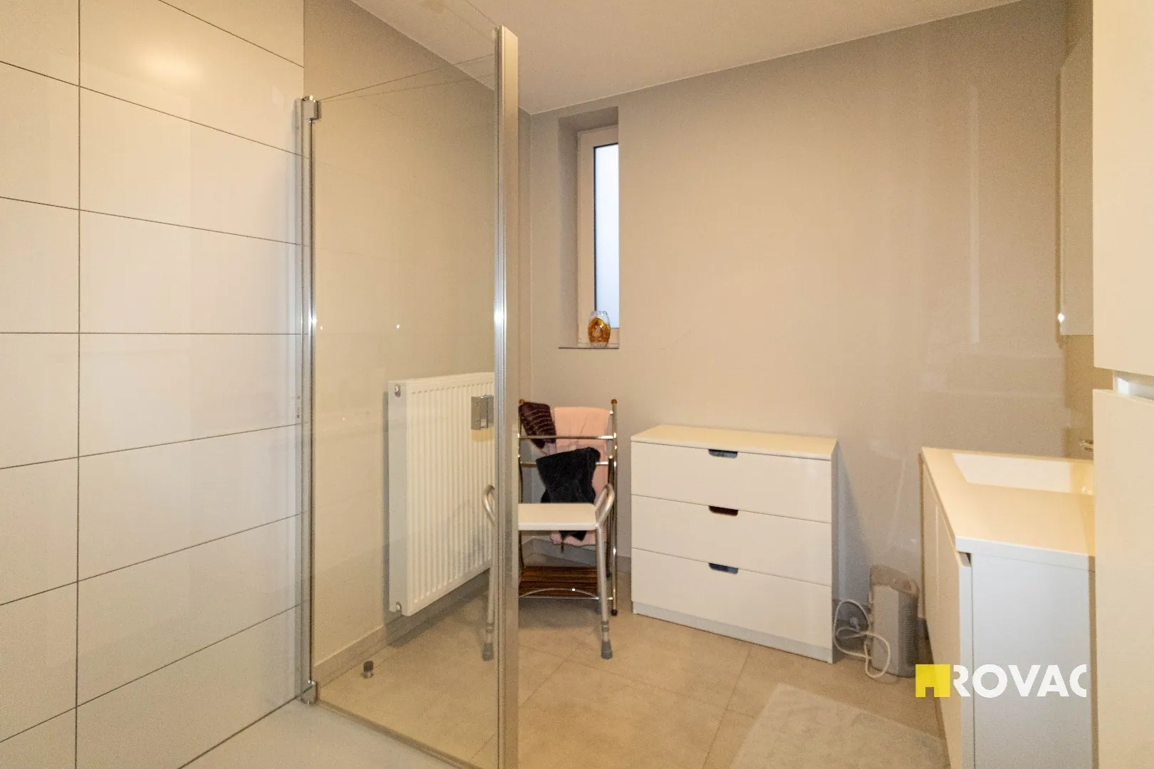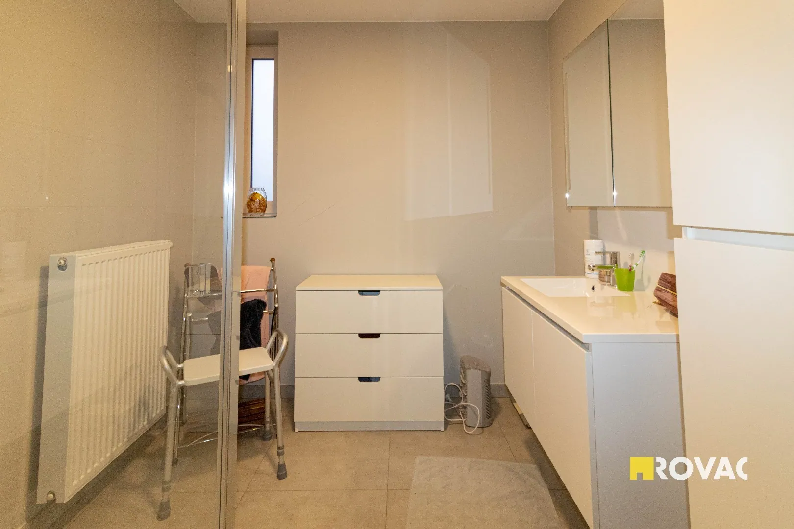 Volledig instapklaar en ruim appartement uitgerust met centrale verwarming op aardgas, bestaande uit inkomhal met gastentoilet, bergruimte/wasplaats, leefruimte voorzien van zonwerende screens met open ingerichte keuken voorzien van alle toestellen zoals kookplaat, koelkast, vaatwasmachine, oven en microgolfoven, extra bergruimte, ruim zonneterras, badkamer met inloopdouche en lavabomeubel, 2 slaapkamers, ruime garage voorzien van elektriciteit.