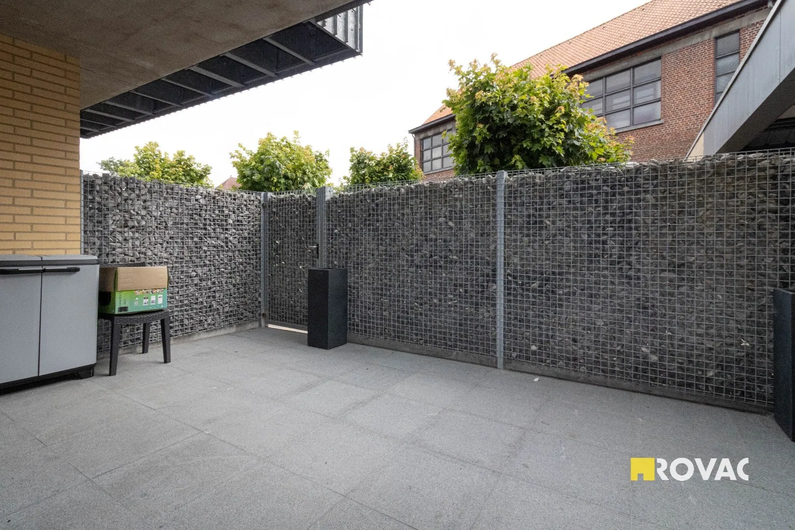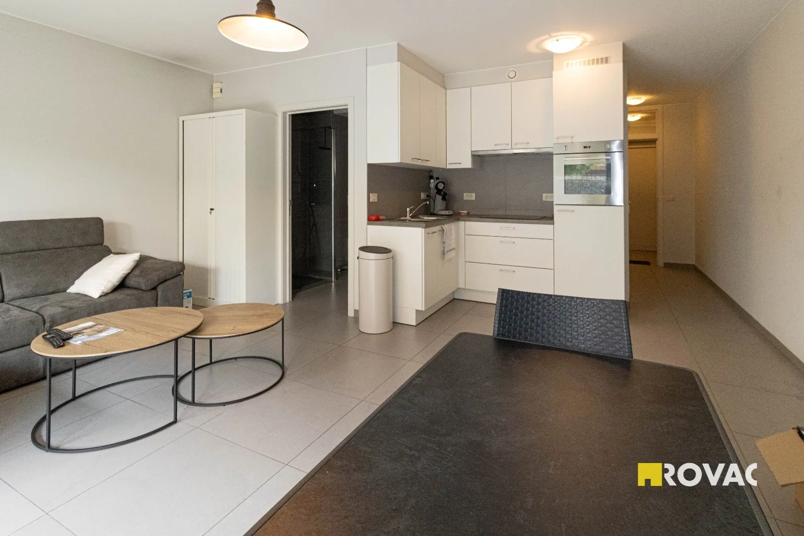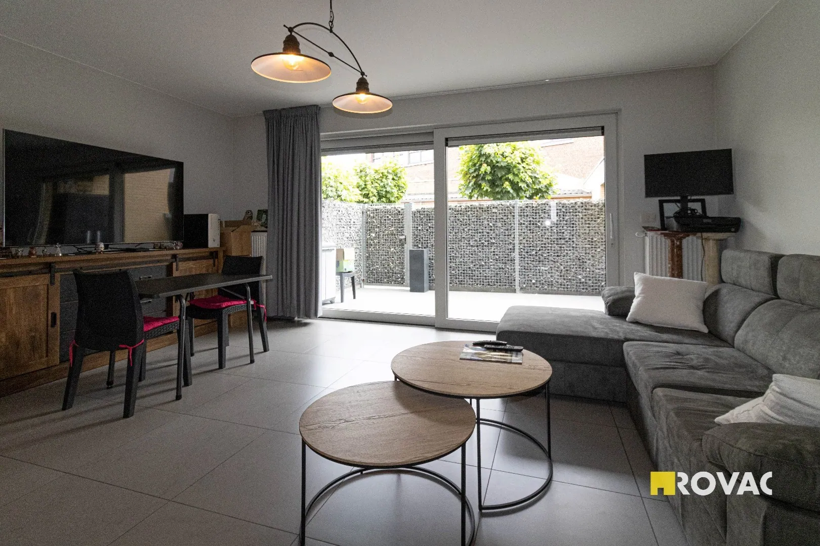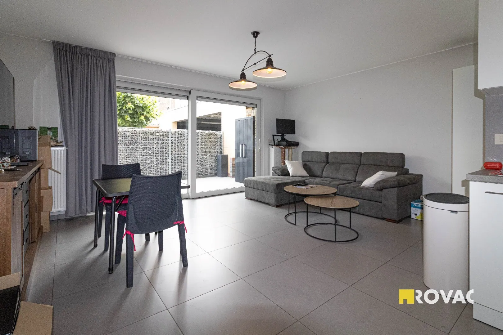Centraal gelegen en gezellig appartement op het gelijkvloers - 62 m² - bestaande uit inkom, leefruimte met zicht op zuidgericht terras, open ingerichte keuken, wasplaats-berging, badkamer met inloopdouche, toilet en lavabomeubel, 1 ruime slaapkamer voorzien van rolluiken, zuidgericht terras met uitweg achteraan, private parking in garage, private berging, algemene fietsenberging, aangelegd binnenplein. Verwarming : CV op aardgas. Appartement is vrij vanaf 01/07/2026. Voorschot gemeenschappelijke lasten : + € 20 / maand. Ref. : 9444.