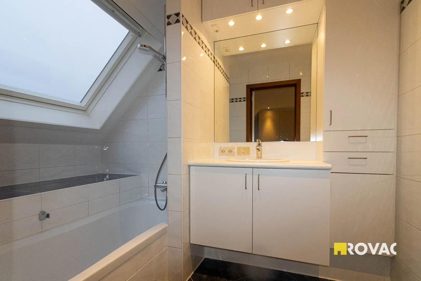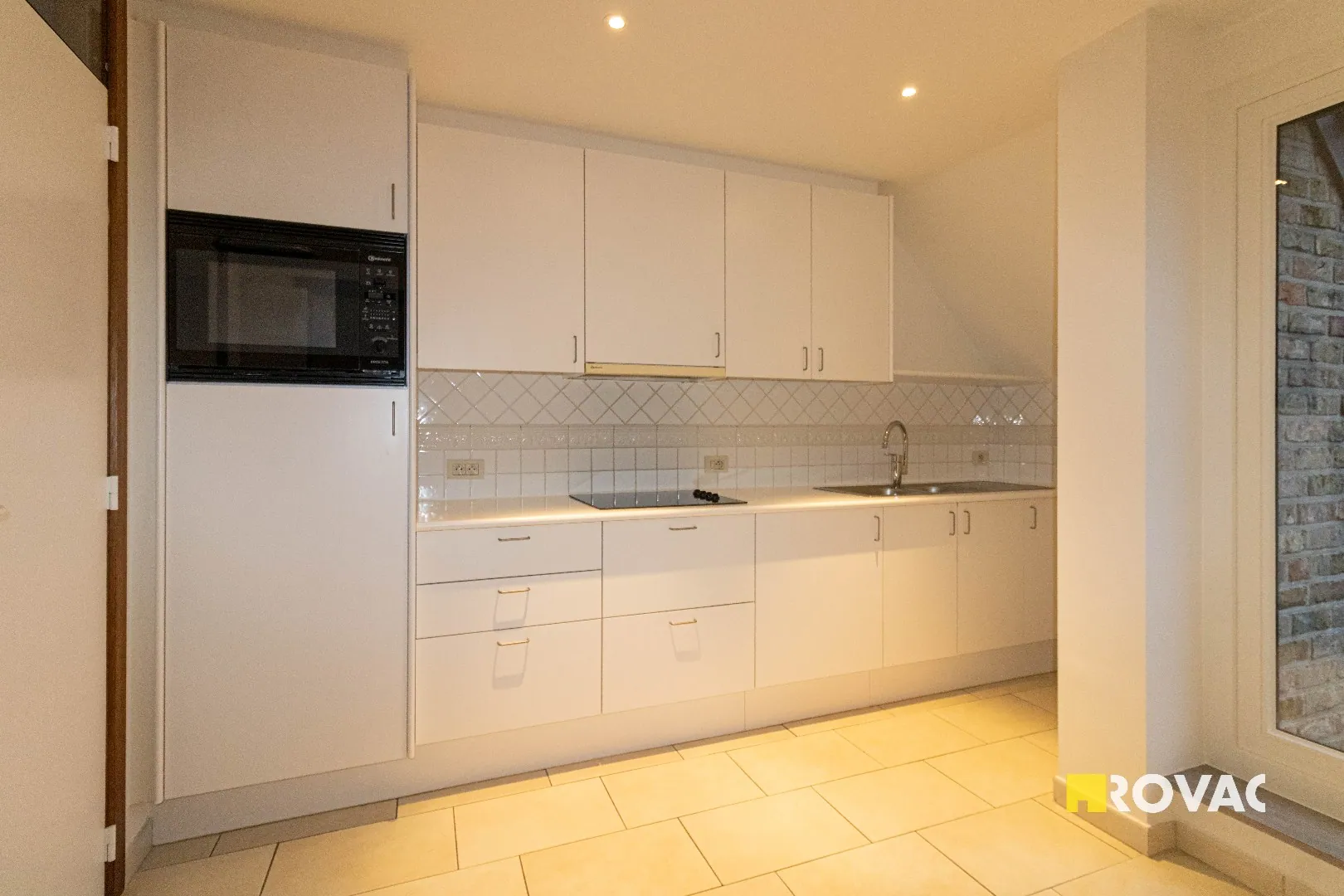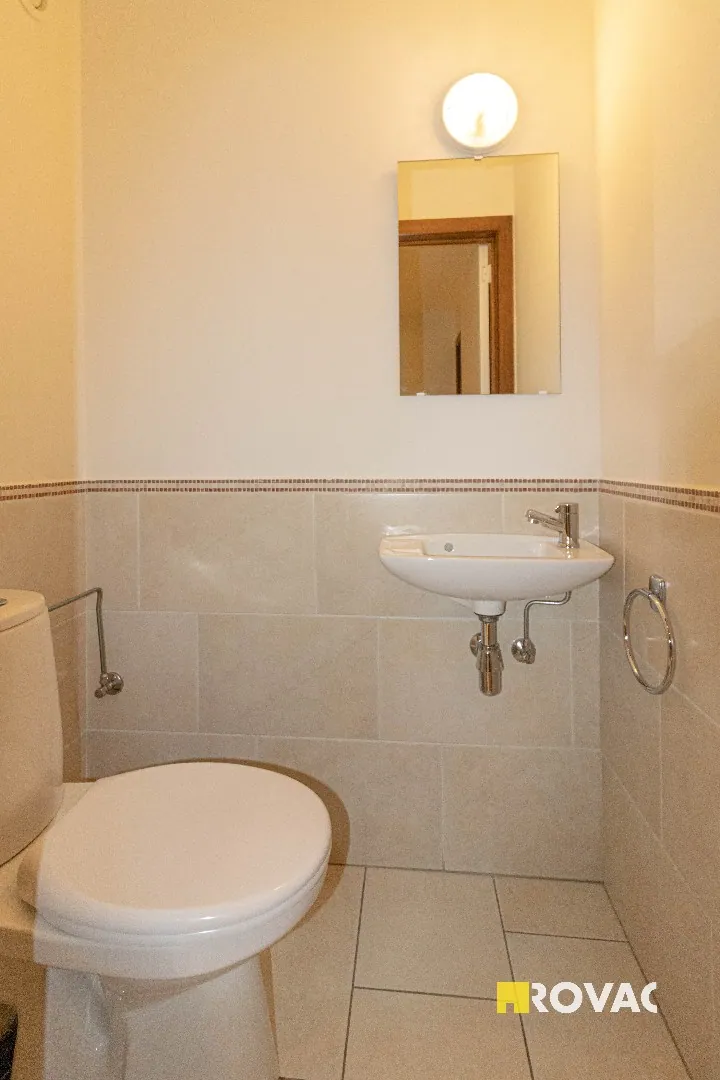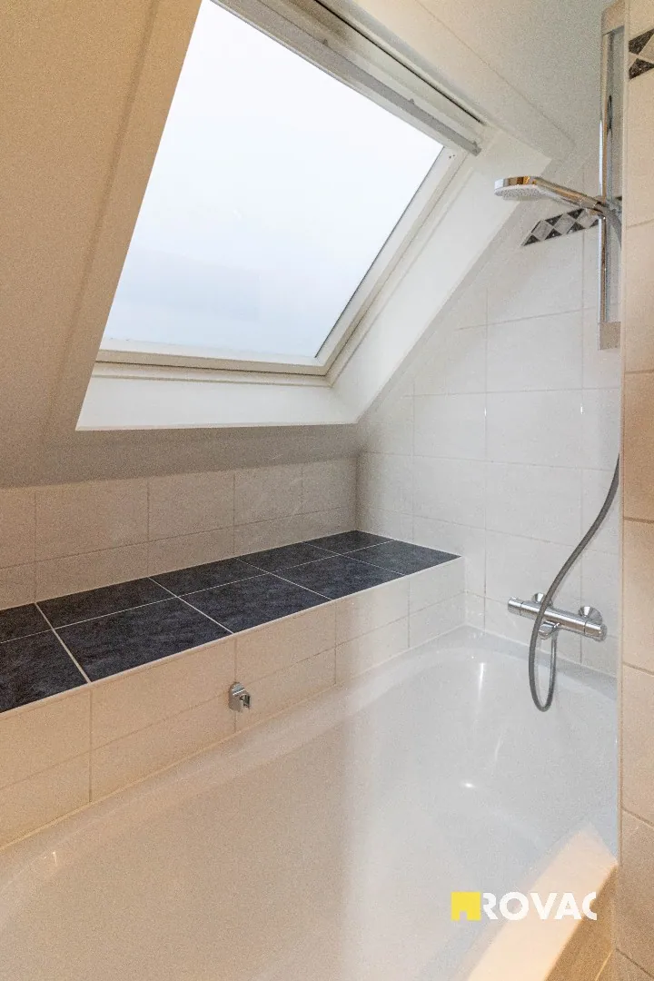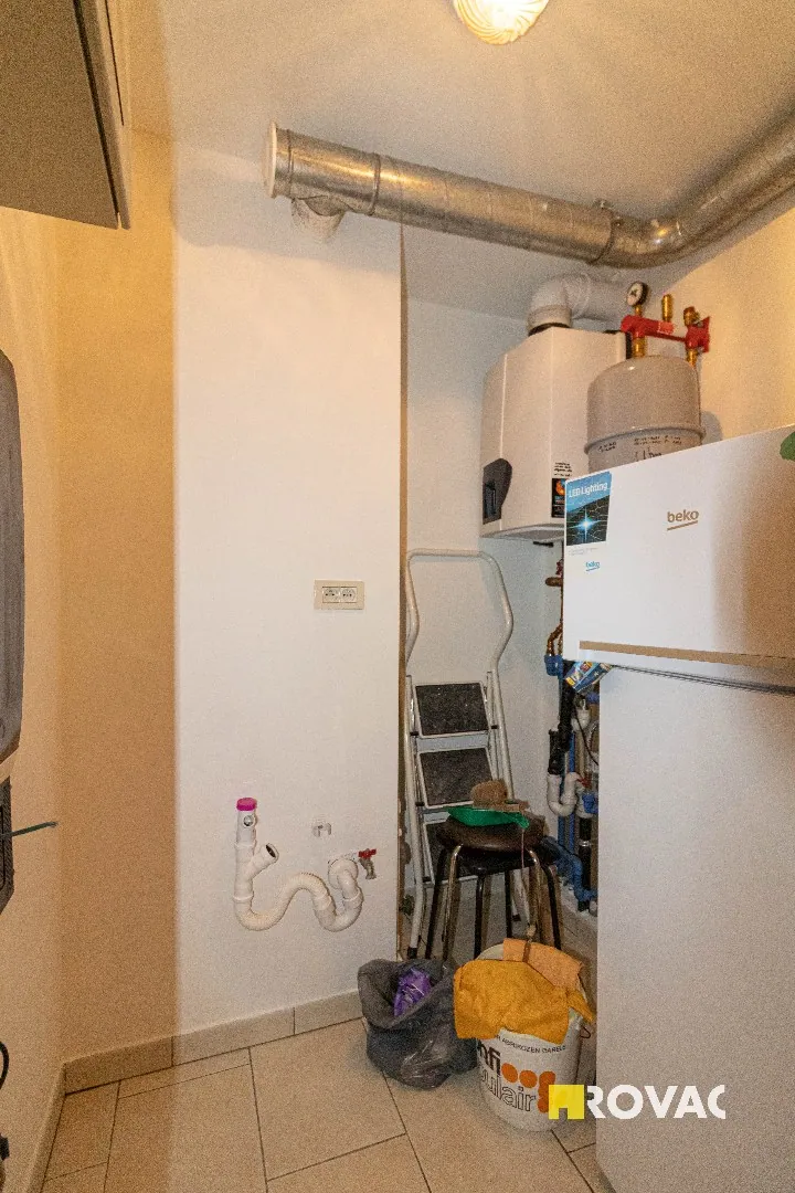 Opnieuw geschilderd en instapklaar dakappartement - ca. 70 m² - bestaande uit inkom met apart toilet, ruime en lichtrijke leefruimte, terras met zicht op vijver, gesloten keuken uitgerust met kookplaat en oven, aansluitende berging voorzien van koelkast met diepvriesvak en wasmachineaansluiting, badkamer met ligbad en badkamermeubel, 1 slaapkamer met ingemaakte kast, ruime garage voorzien van elektriciteit. Centrale verwarming op aardgas. Lift aanwezig in het gebouw. + € 75/maand gemeenschappelijke lasten inclusief voorschot privaat waterverbruik. REF.: 9420